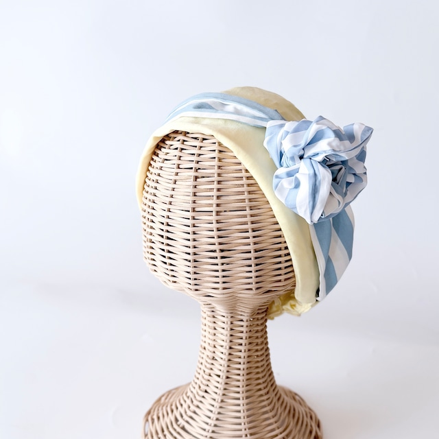 【顔色パッと明るく】爽やかレモンイエロー×水色ストライプのターバンリボン 医療用帽子・ケアキャップ