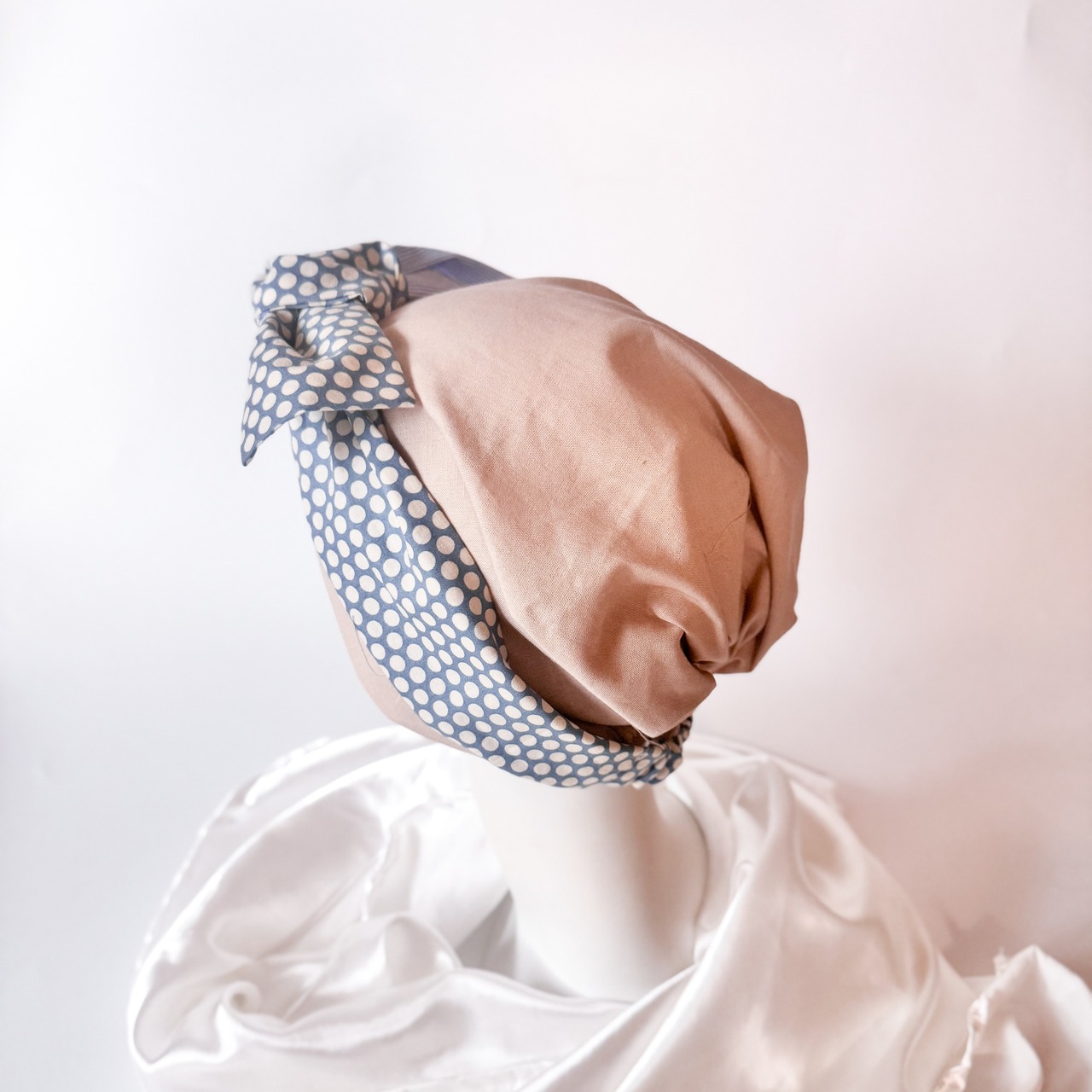 【新作】シンプルキャップとターバンリボンセット ケア帽子 水玉ブルー オプションコサージュ 医療用帽子 楽ちん 笑顔 プレゼント ギフト 可愛い