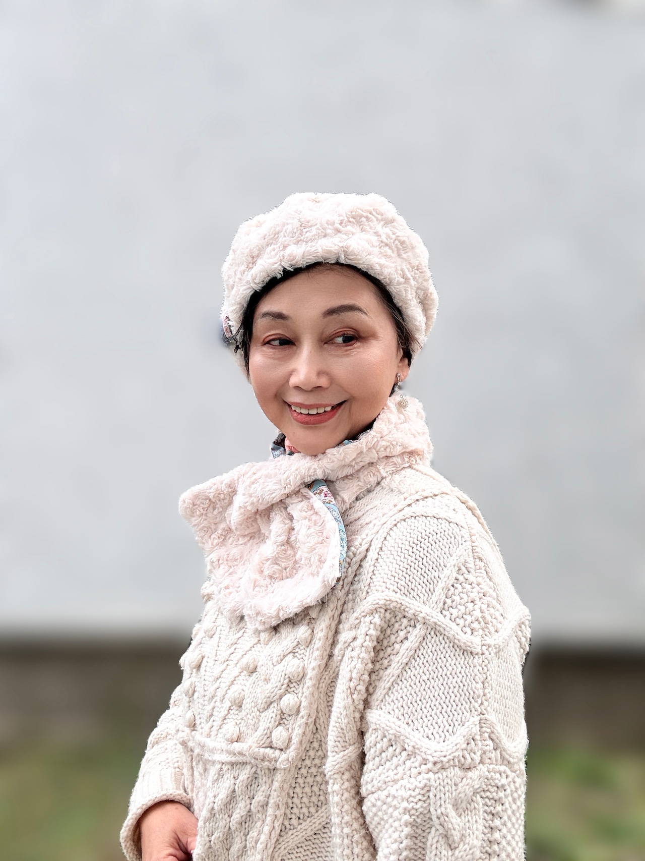 合わせやすいキナリのボアとブルー系アール・ヌーヴォー柄の