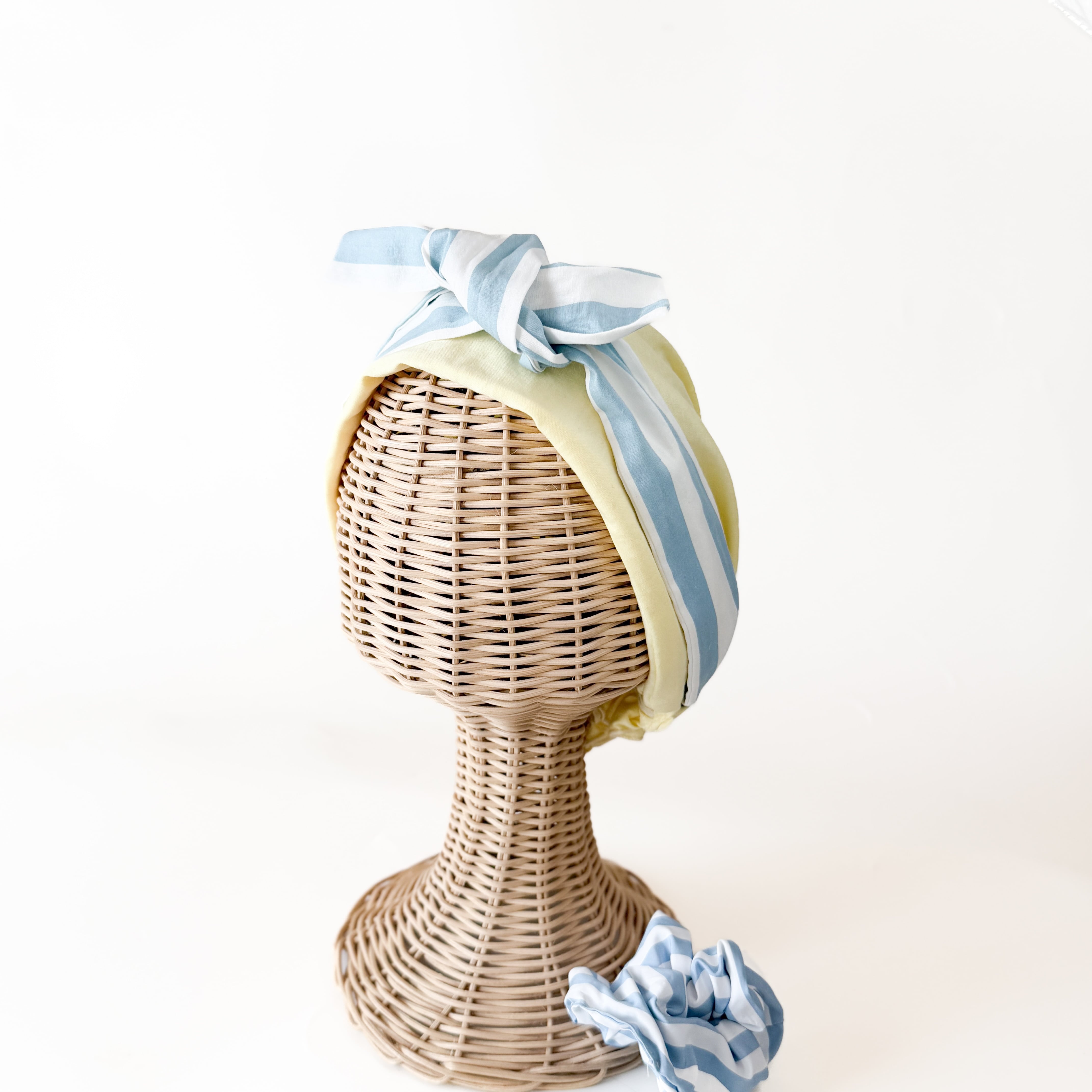 【顔色パッと明るく】爽やかレモンイエロー×水色ストライプのターバンリボン 医療用帽子・ケアキャップ