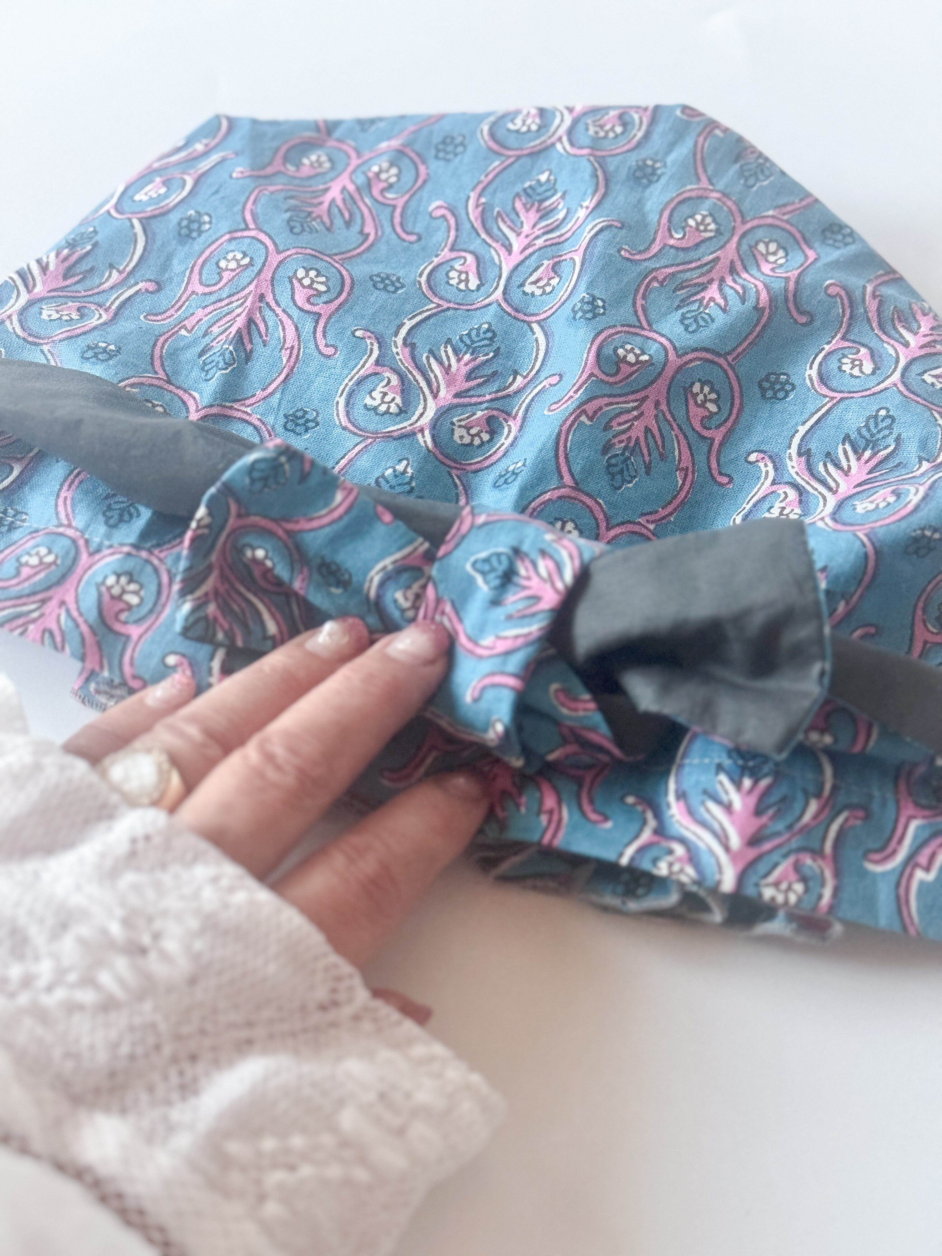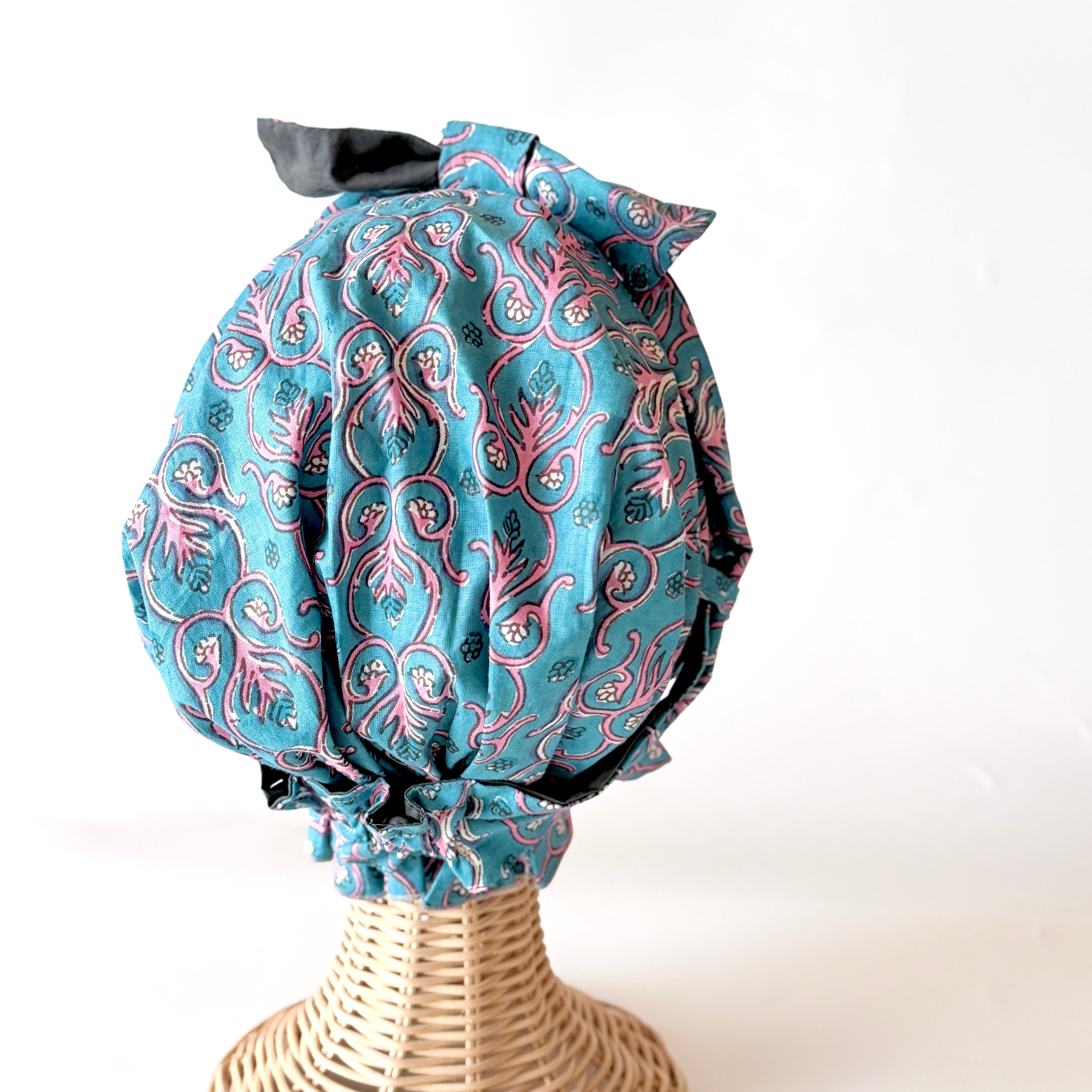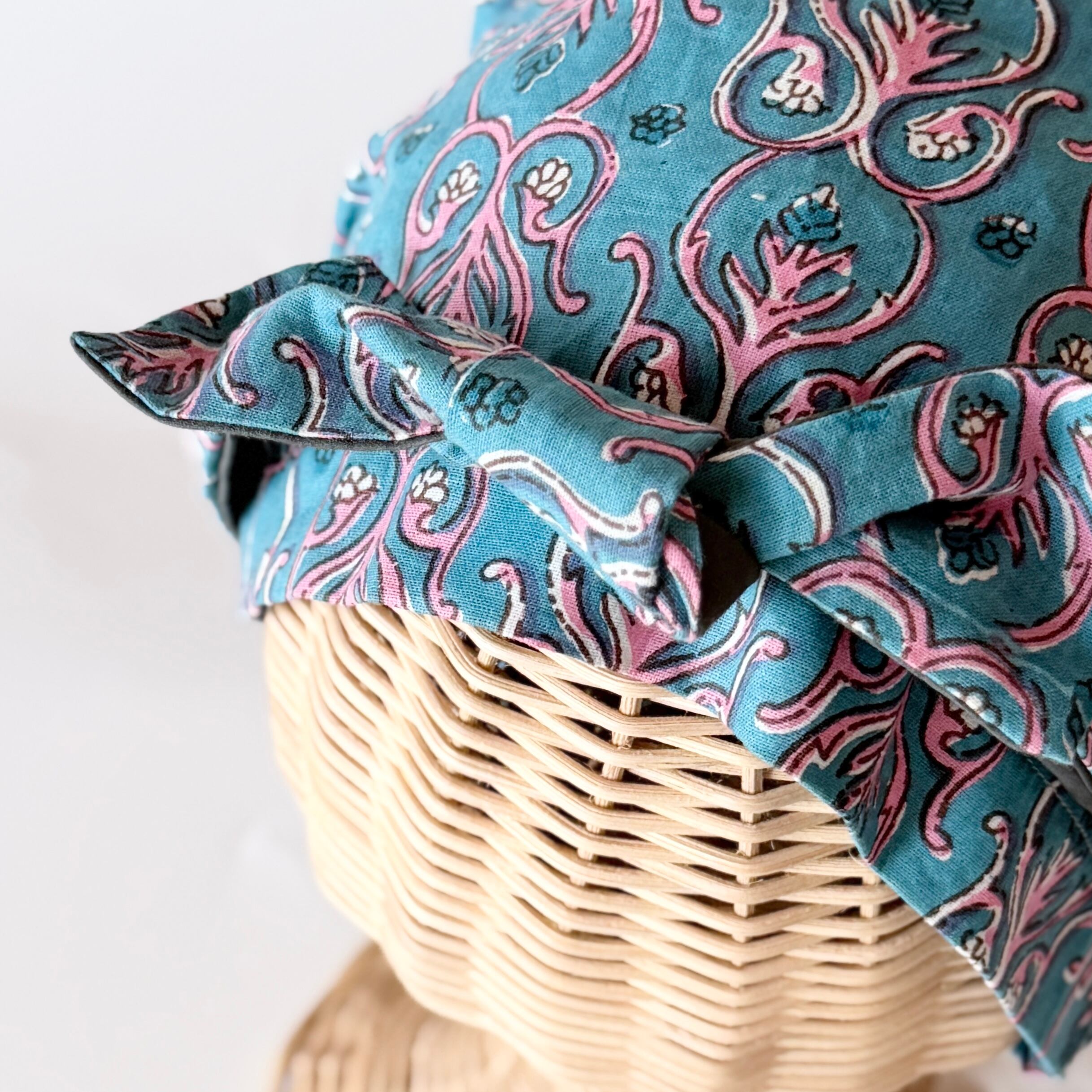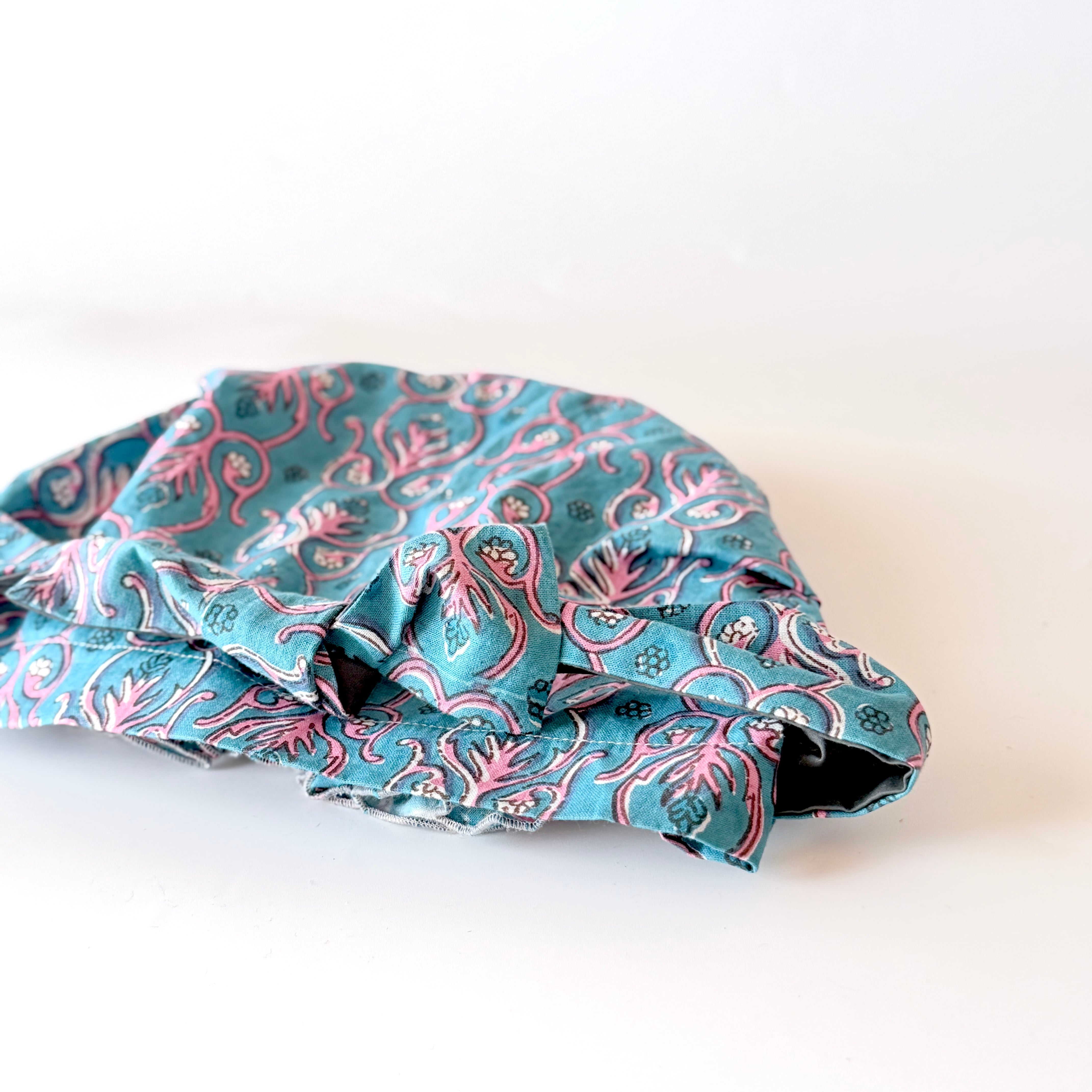 落ち着いたターコイズブルーをベースに、ピンクとキナリのラインで描かれた更紗風ボタニカル柄。