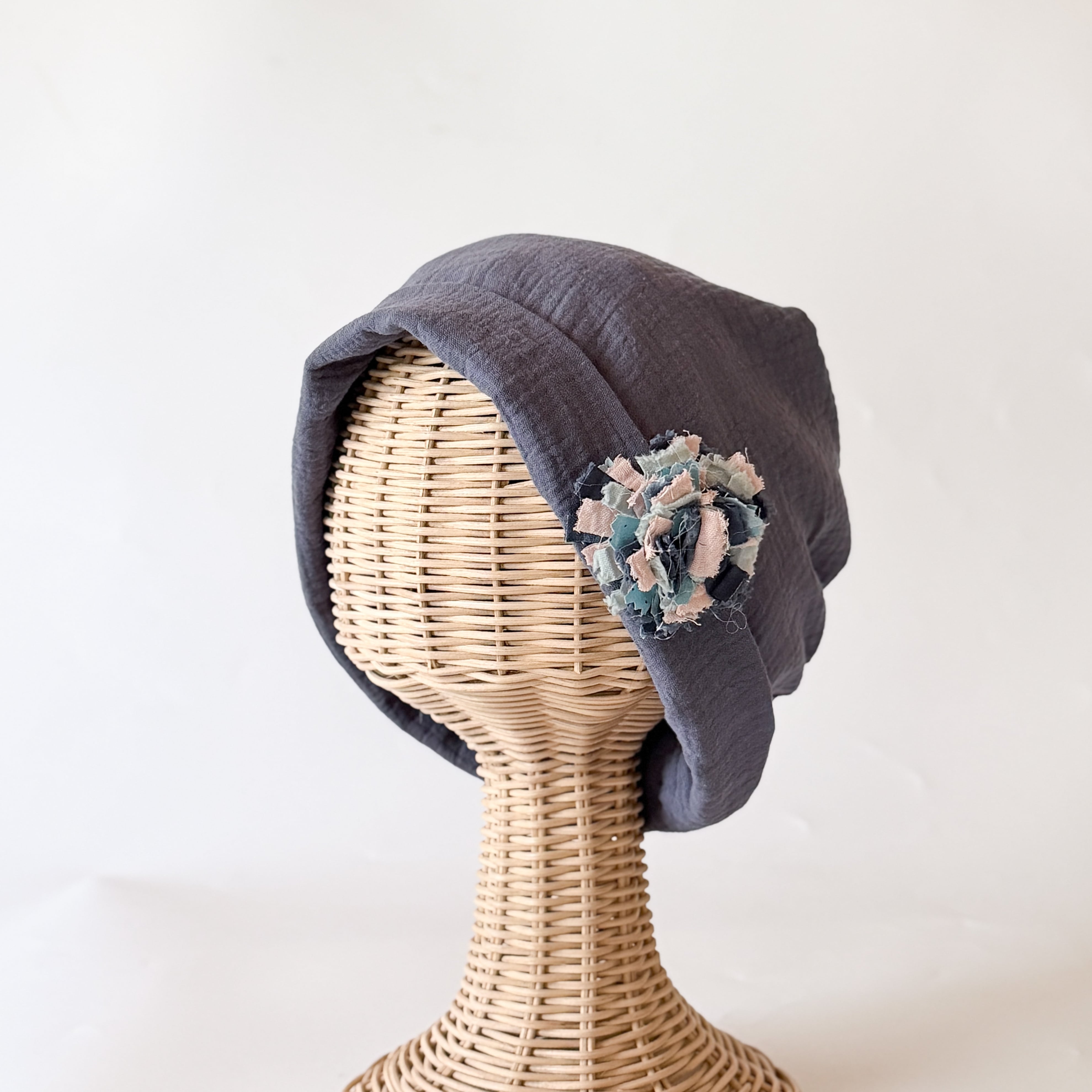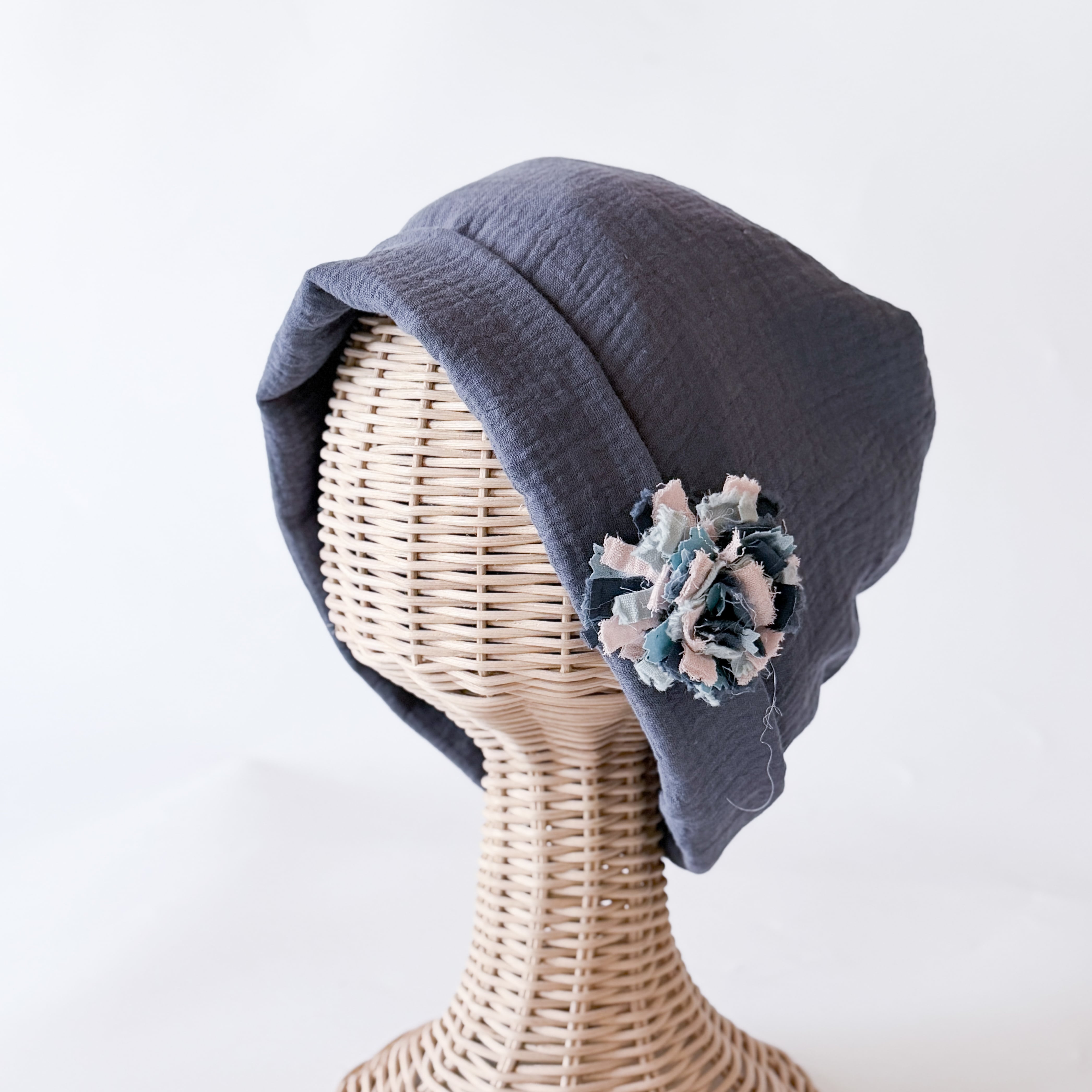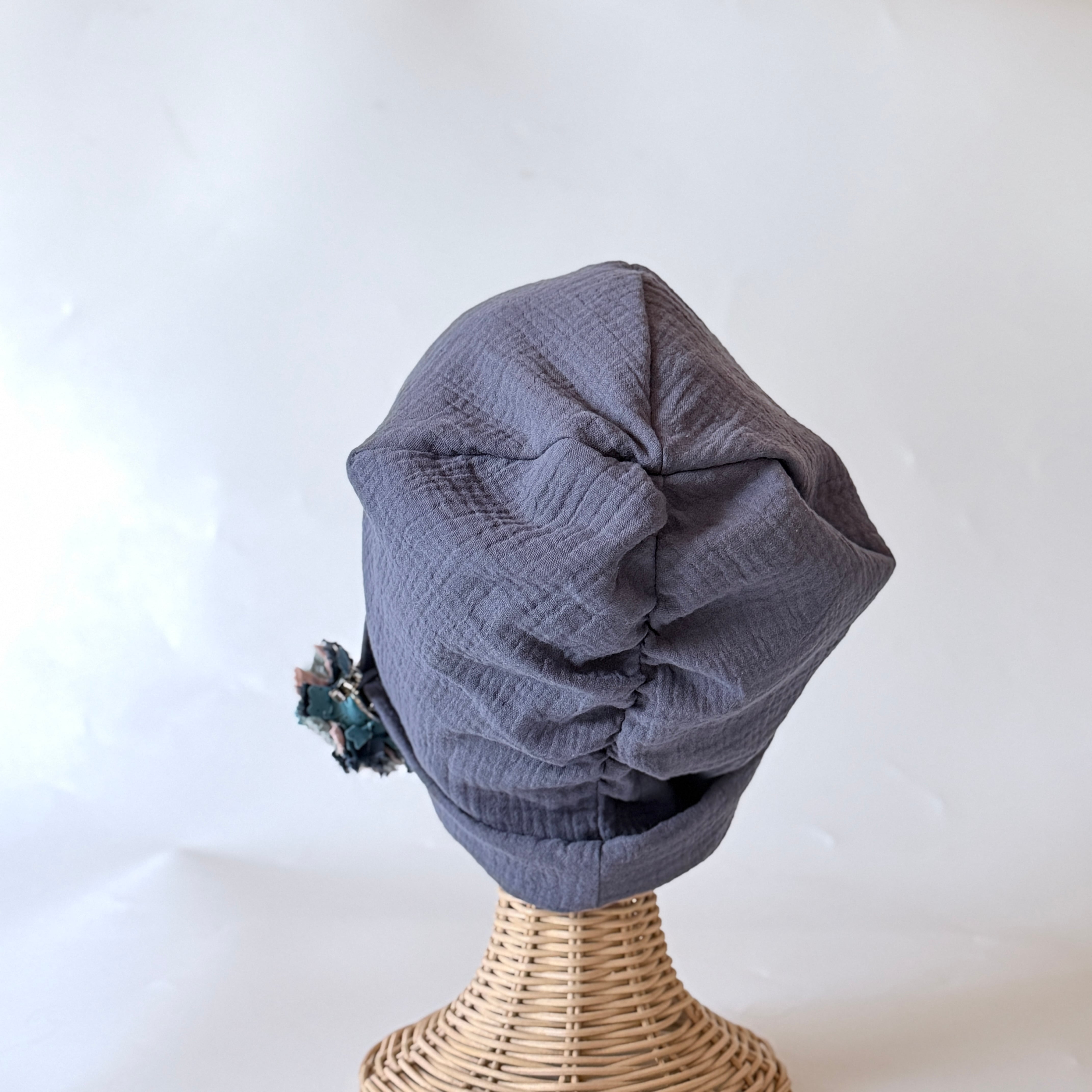 ふわっと包まれる癒し ふわふわガーゼ キャップ型 ケア帽子 リラックス 癒し ネイビー 入院帽子 プレゼント ブローチ付き