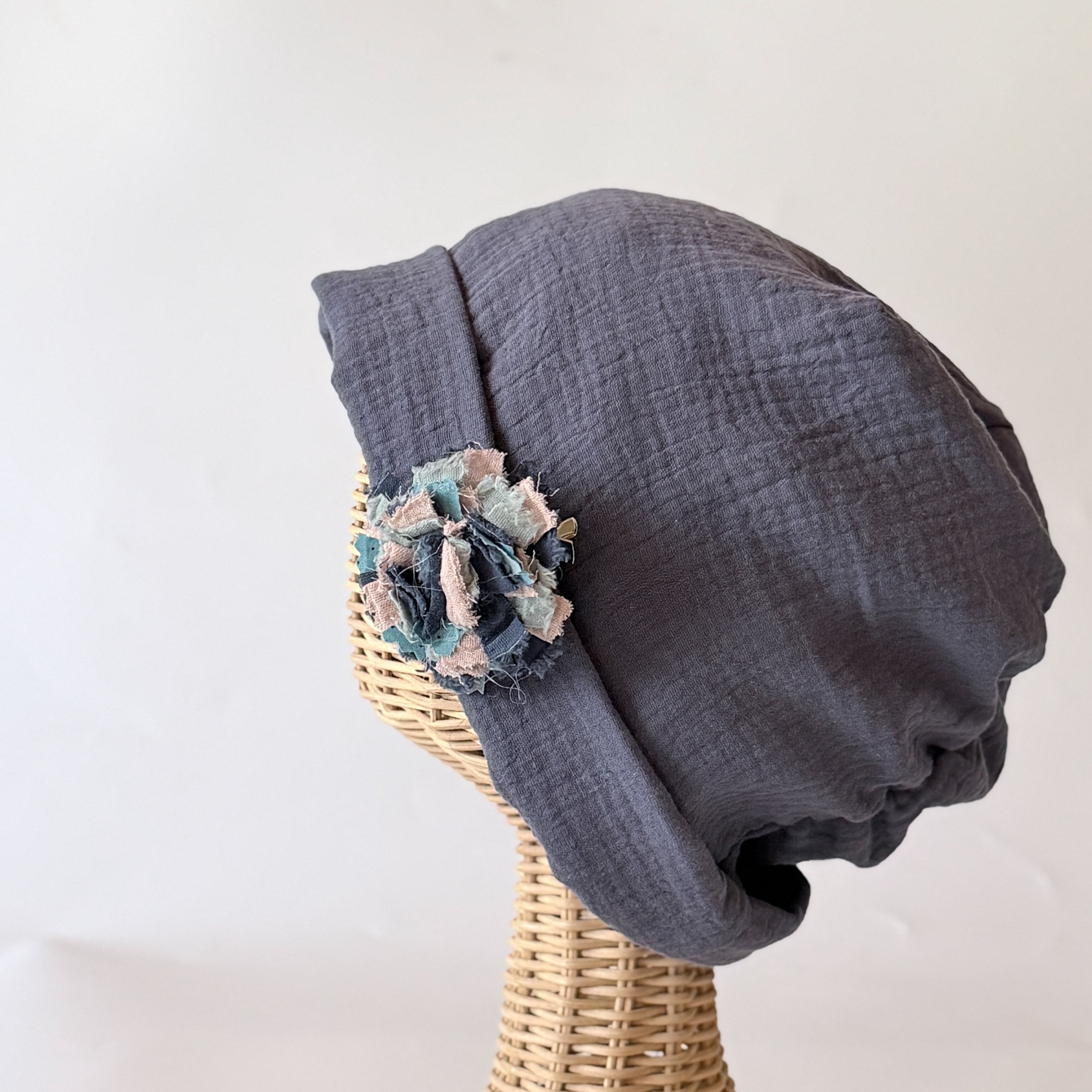 ガーゼを使った癒しのケア帽子です。