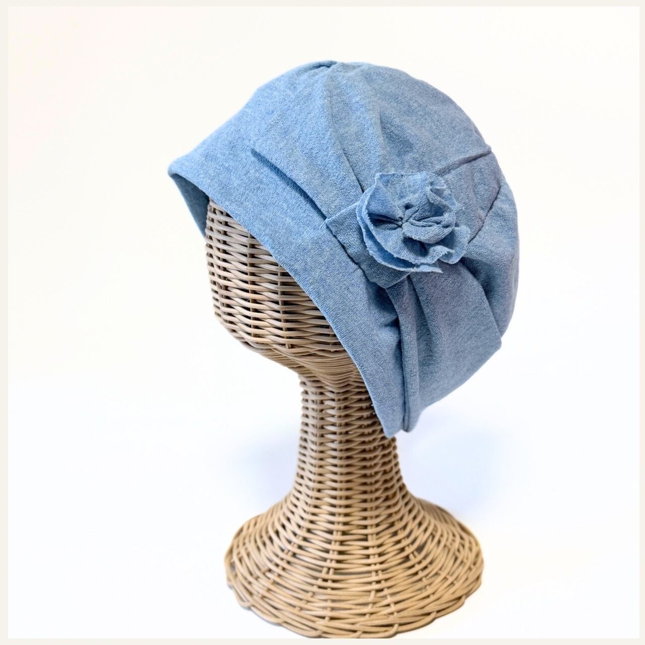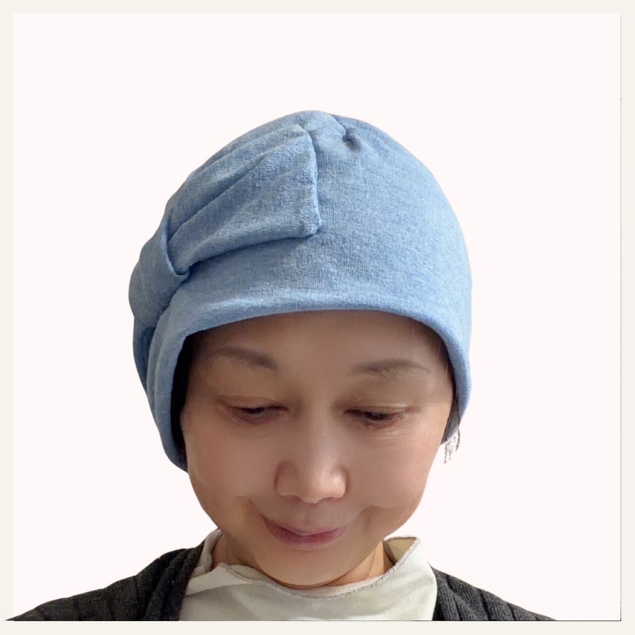 さわやか ブルー リボン ケア帽子 室内帽子 ちょっとお出かけ用