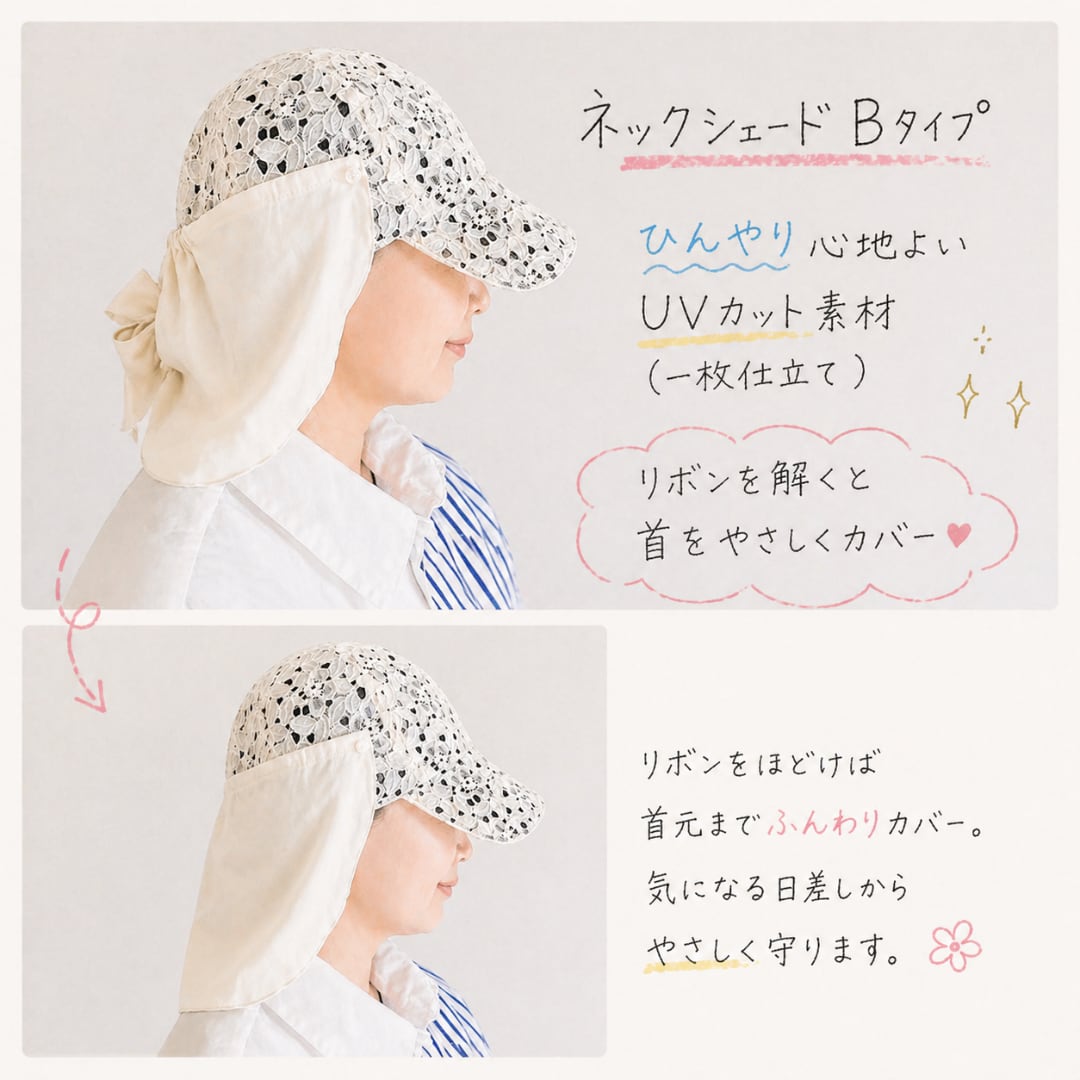 通常リボンで日差しが強い時は、ホックを外すと気になる首をカバー