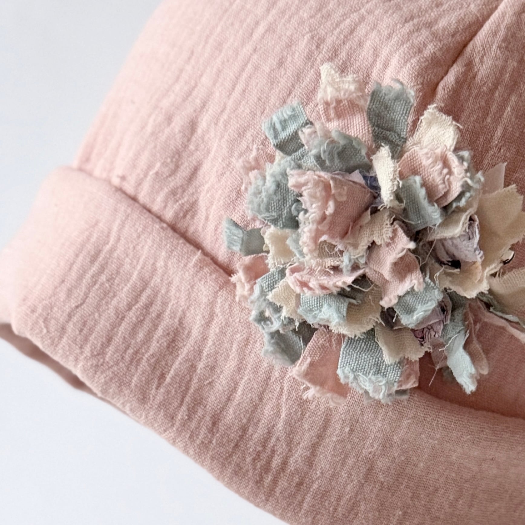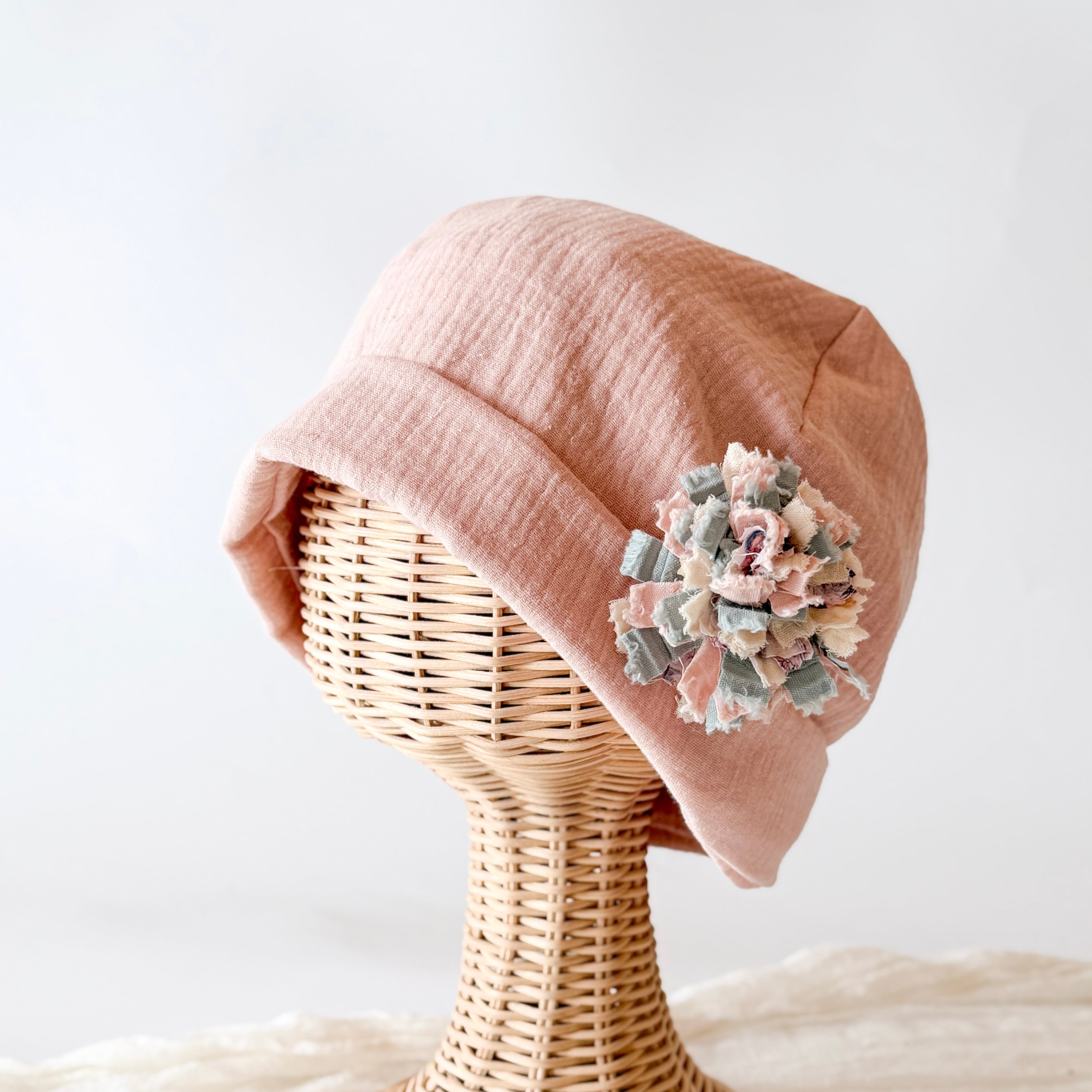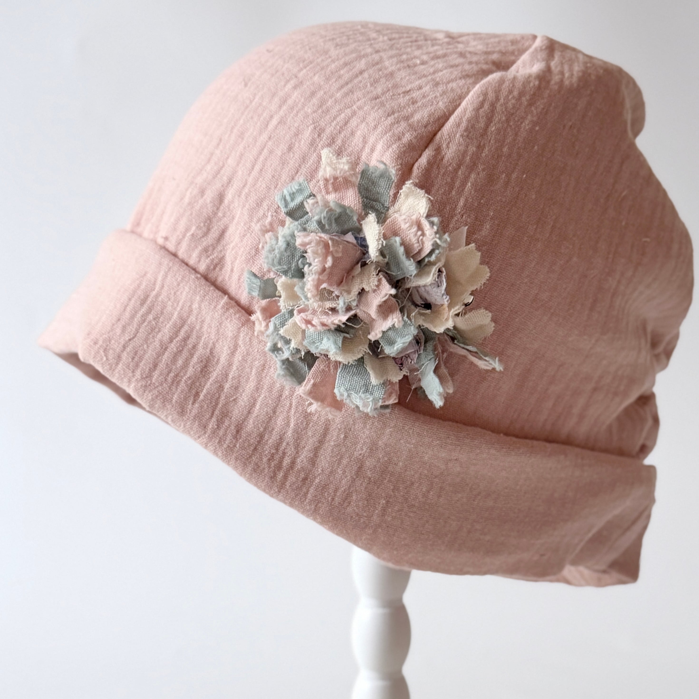 ふわっと包まれる癒し ふわふわガーゼ キャップ型 ケア帽子 リラックス 癒し ピンク 入院帽子 プレゼント ブローチ