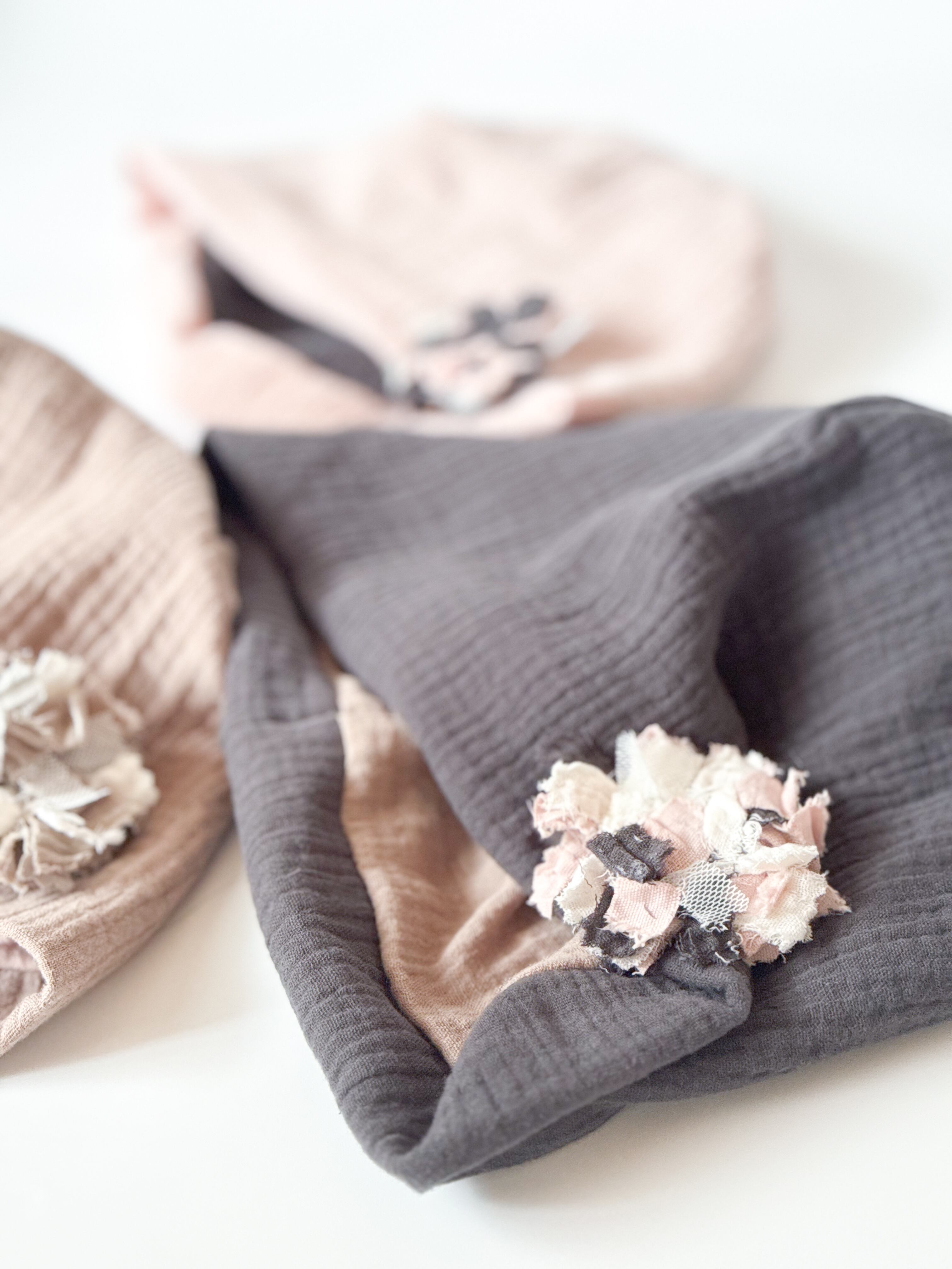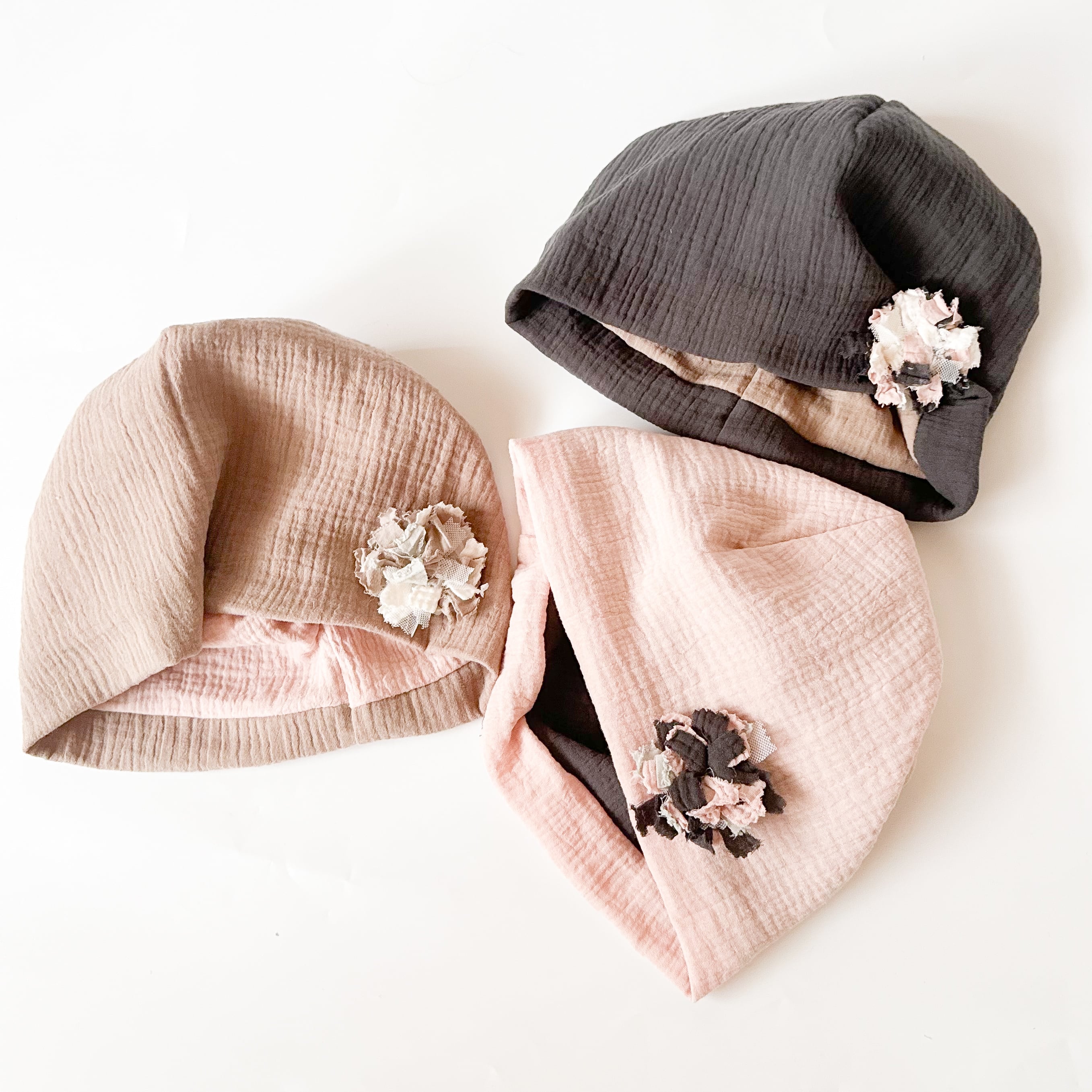 ガーゼを使った癒しのケア帽子です。