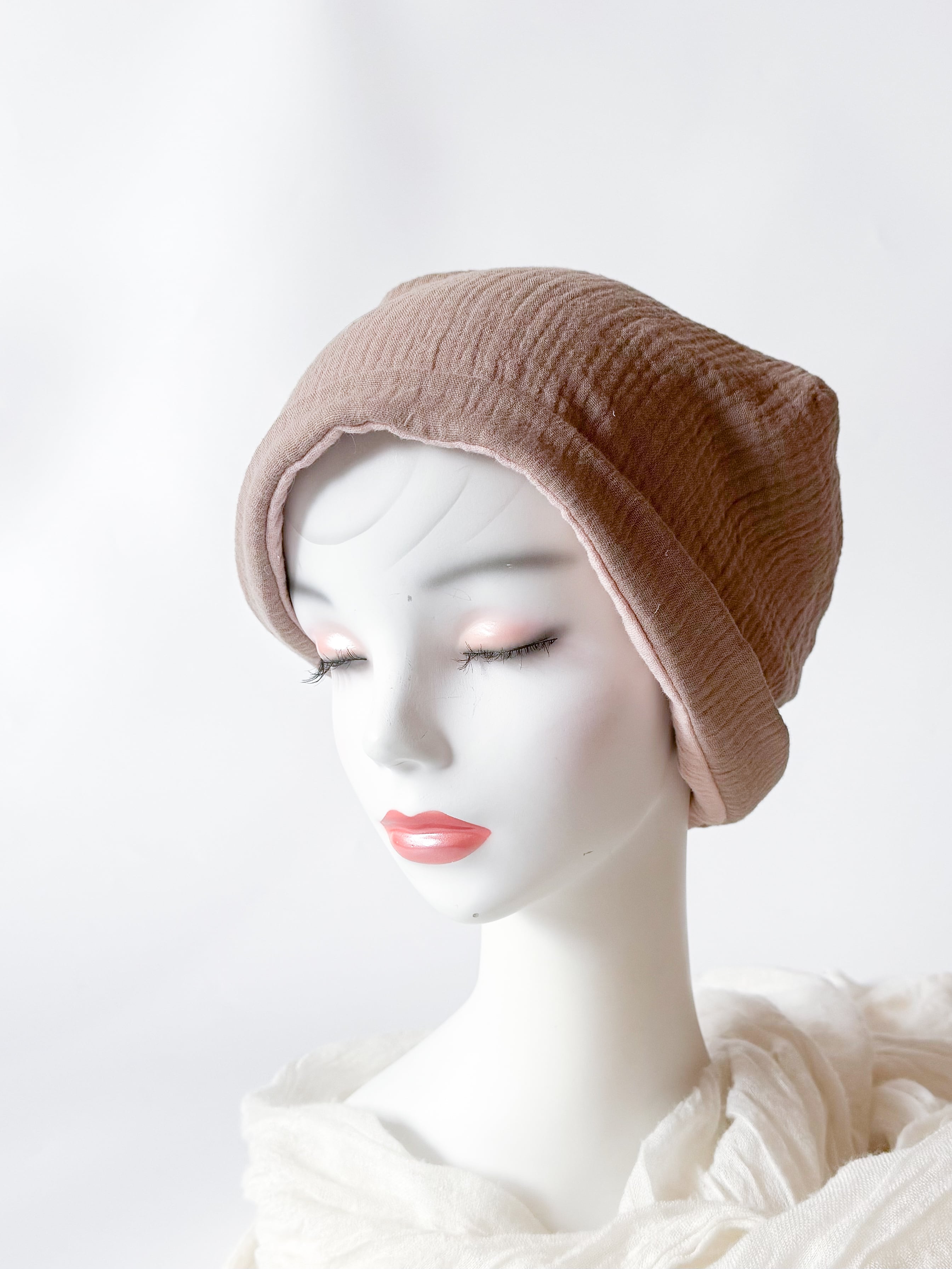 ふわふわガーゼ キャップ型 ケア帽子 リラックス 癒し モカ✖️ピンク 柔らかい 入院帽子 プレゼント ブローチ付き